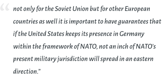 This bring us to another, important key event in this history- the discussion between US Secretary of State, during 1990s and Soviet Union President, Mikhail Gorbachev, where Baker’s assurance as a US secretary of state, that NATO will “not move an inch eastwards” . NATO as we know, was a military org created during Cold war, against Soviet.
