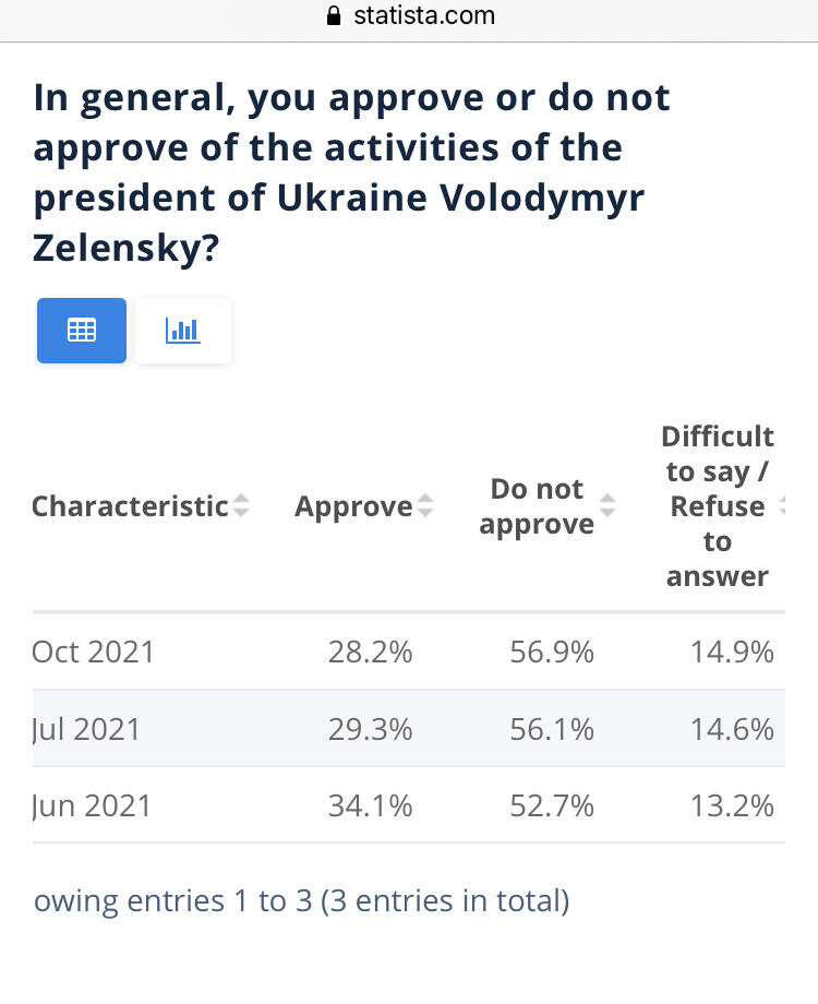The first thing I came across, something that wasn’t shared by media, was that Zelensky apparently had very poor approval ratings just before the war, which was constantly falling.