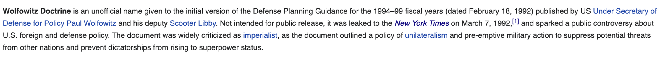 It helps to understand, what was actually going on in US policymaker’s mind back then. One event that is quite important to see this, is when a document, around the same time in 1992, got produced- Wolfowitz Doctrine
