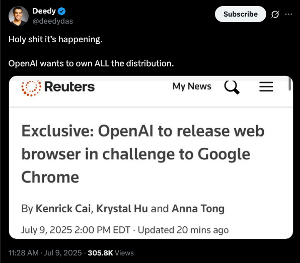 The fundamental belief in my opinion, OpenAI and Perplexity of the world are trying to go after is two fold: