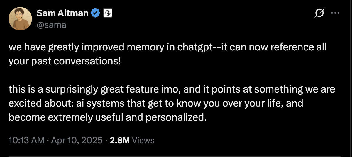 Memory has become quite discussed topic last few months, primarily in my opinion driven by Sam Altman’s tweet on ChatGPT Memory. This has led to as usual a flurry of developer and VC folks in the Valley jumping the gun on Memory as the MOAT for GenAI Apps. Silicon Valley is (in)famous for herd style thinking on various topics in tech/society so I wasn’t surprised how fervent the discussion on Memory became that many VCs started investing in Memory as Infra play.